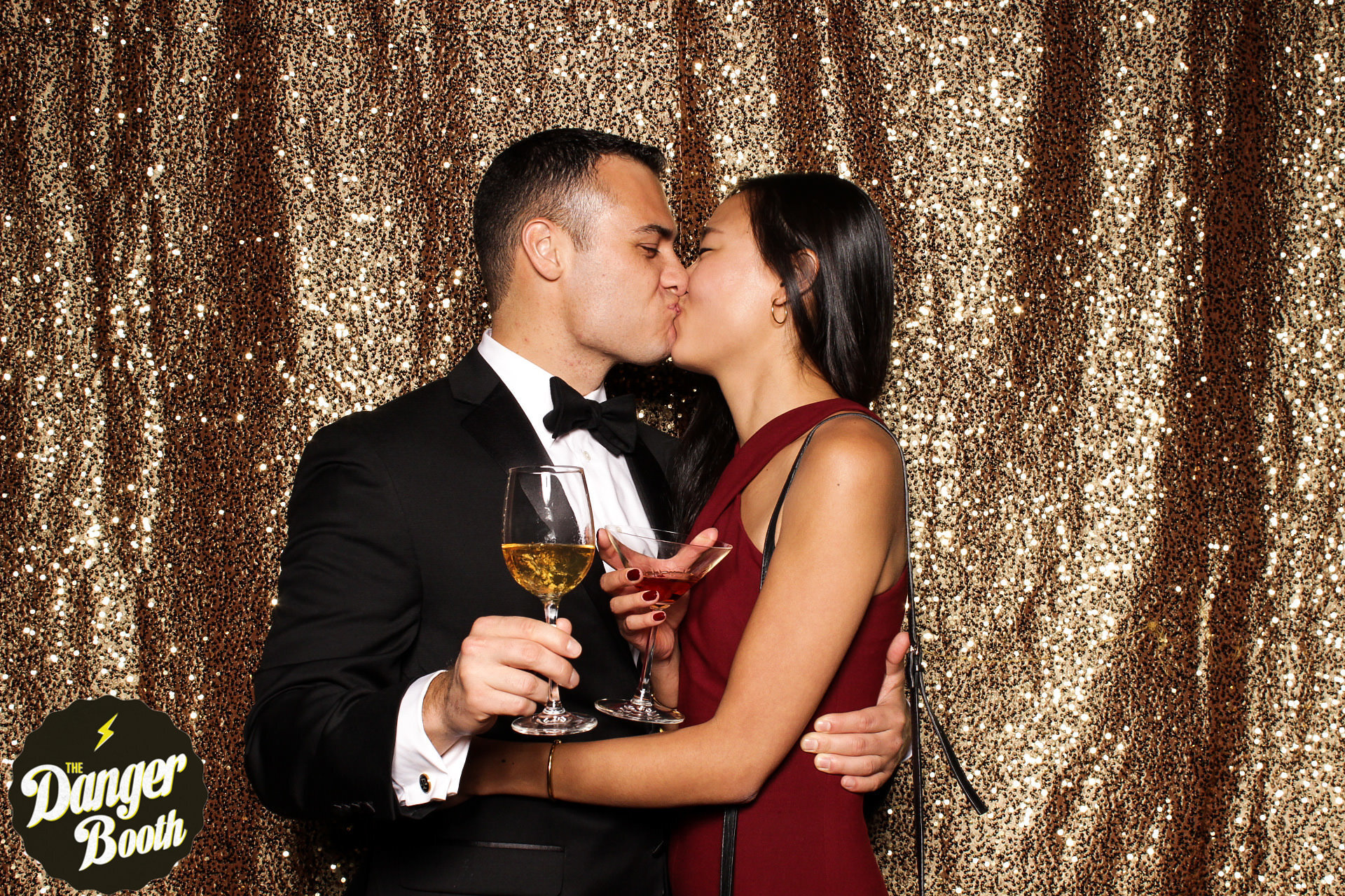 We had such a fantastic time getting dangerous with Kaori and John on their big day! The Danger Booth fit seamlessly into this couple's elegant affair with our chic gold sequined photo booth backdrop. We really loved that John and Kaori chose to keep things simple and sophisticated by skipping the props and focusing on the folks having fun! An open air photo booth is a great way to keep wedding guests entertained all night long, and we were so excited to be a part of this special day! Congrats Kaori and John!